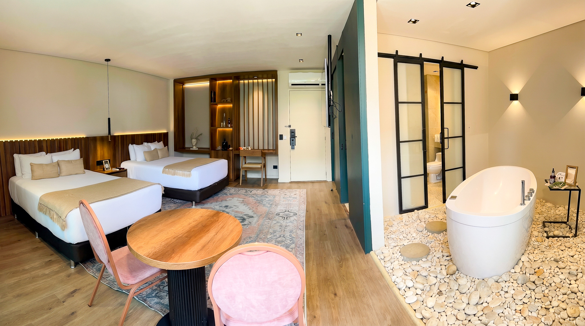 Las Habitaciones Superior Twin con Bañera es la opción definitiva para quienes viajan acompañados y buscan un descanso superior en un entorno de diseño industrial y acogedor. Sus dos amplias camas independientes aseguran una comodidad total, perfectas para recargar energías después de un día de negocios o exploración en Medellín.